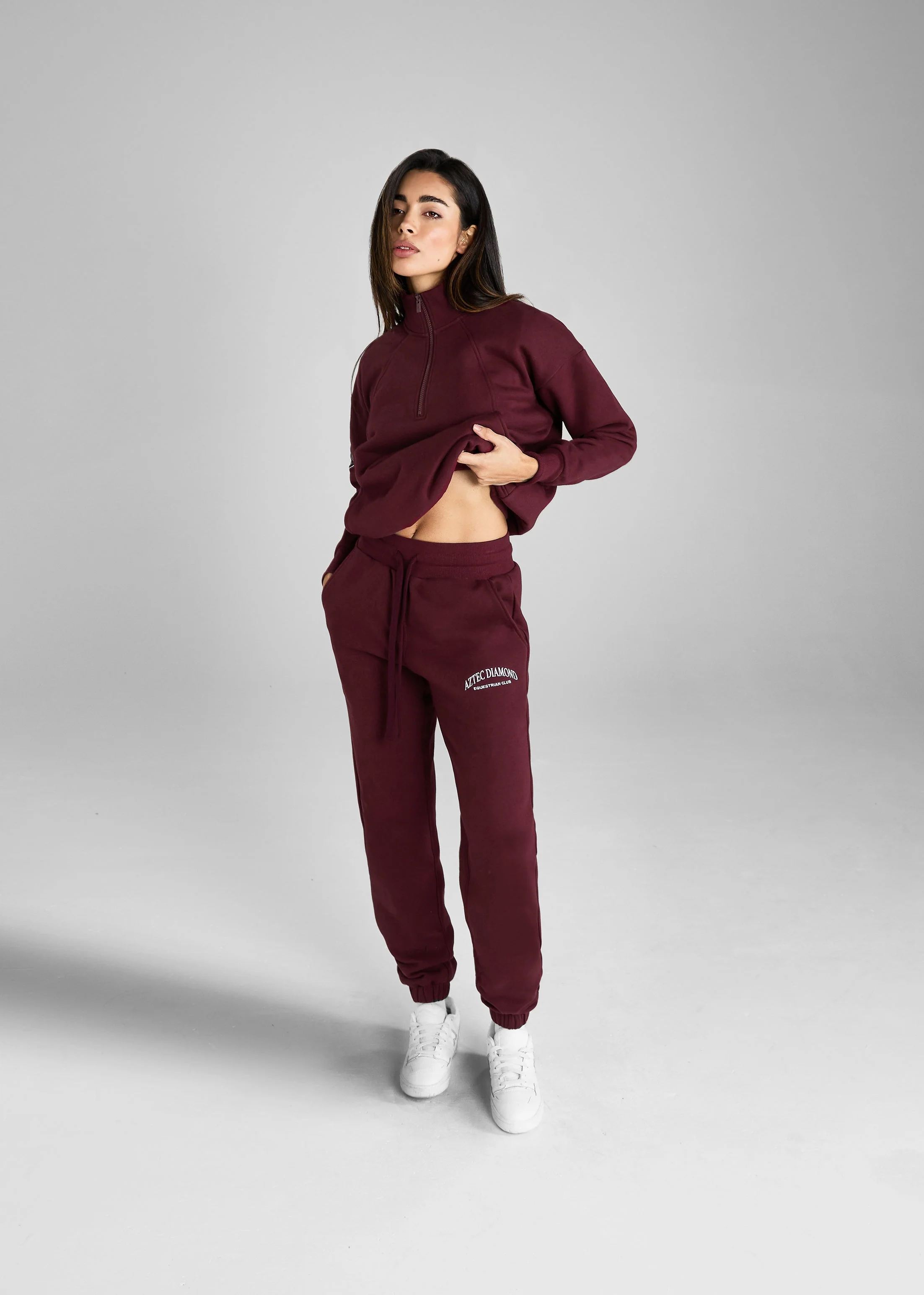 Model posiada elastyczny pas ze sznurkiem do regulacji, dwie praktyczne kieszenie z przodu oraz sportowe detale – haft w stylu Equestrian Club na lewej nogawce i trójwymiarowe z tyłu.